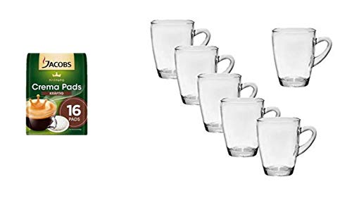 Jacobs Spitze Crema Kraftvoll 16 Wachmacher Pads, 1er Abschaum + 6 x Wasserglas Henkelbecher 310ml,