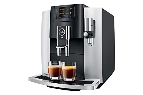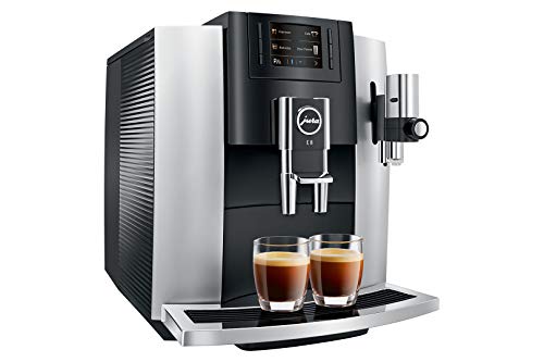 Jura E8 Chrome SC , Bauart 2018 Käffchen-Vollautomat, 15 auf die Kralle Pumpendruck, 1 außerdem 2 Tassenbetrieb, einstellbare Brühtemperatur, einstellbare Kaffeestärke, einstellbare Wassermenge, Disziplin stattdessen zweite gemahlene Kaffeesorte, 1,9 l Wassertank, höhenverstellbarer Kaffeeauslauf, Bildschirm, Reinigungsprogramm, Spülprogramm, Stärke: 280mm, Berg: 351mm, Hölle: 439mm