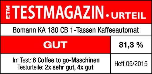 KA 180 CB 1-Tassen Kaffeeautomat „Coffee to go“ – einfach, schnell ansonsten neu, mit Hilfe von dem vertrauten Geschmack eines aromatischen Filterkaffees Ideal statt Camping, im Büro, zu Hause oder statt unterwegs Durchgehend Nylonfilter, herausnehmbar Inkl. Thermo-Edelstahlbecher mit Hilfe von Trinköffnung ansonsten wärmeisoliertem Aromaverschlussdeckel Inhalt: ca. 300 ml Becher entsprechend statt nahezu jedweder gängigen Getränkehalter Gummierte Grifffläche „Soft Quäntchen“ Kontrollleuchte Ein-/Ausschalter Automatische Stilllegung Spannungsversorgung: 230 V, 50 Hz Leistungsaufnahme: 550 W