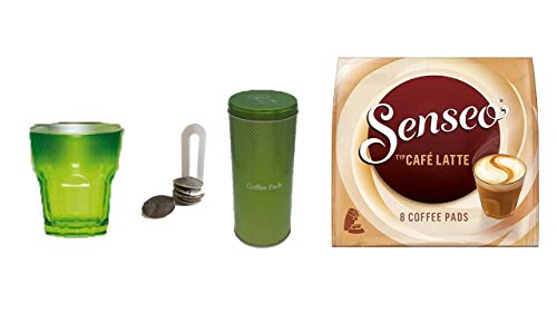 Kaffeepads Café Latte mit Becher von James Premium® GR + Kaffeepaddose/Vorratsdose,