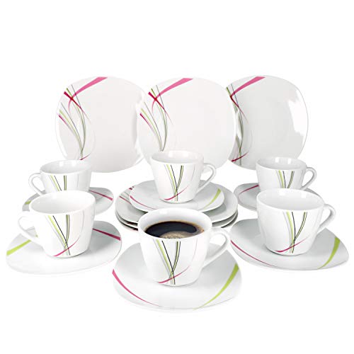 Das vorteilhafte Set, für bis zu 6 Personen, beinhaltet: 6 Kaffeetassen, 6 Unterteller und 6 Kuchenteller. Servieren Sie Heißgetränke denn bspw. Tee, Kaffee und heiße Schokolade in den formschönen Porzellantassen und nutzen Sie die kleinen Teller für Torte, Gebäck und Dessert.