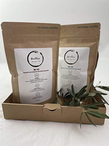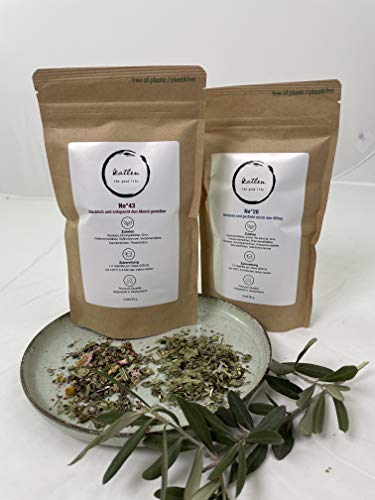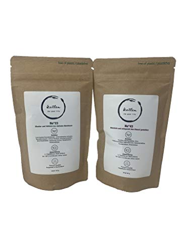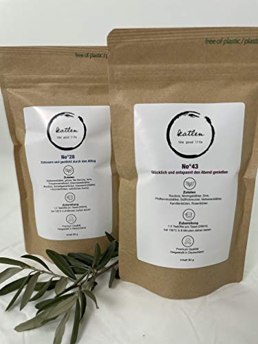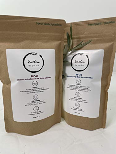 MIT KATLEN – AUF DER WELLE VON “THE GOOD LIFE” SURFEN: ERLESENE PREMIUM KRÄUTERTEE-MISCHUNGEN – MADE IN GERMANY Spürst du das? Wir beordern dir gerade jede Menge “good life”-Power! Unsere köstlichen, aromatischen Kräutertees wurden für dich mit viel Liebe kreiert und werden äußerst hochwertig in Deutschland hergestellt. Für uns von Katlen ist eins (tee-)klar: Wir möchten sinnvolle Produkte anbieten, die ökologisch möglichst nachhaltig sind und außerdem, wo möglich, soziale Projekte unterstützen. Der Beutel, der kein Plastik braucht! Wir setzen bei der Verpackung unserer Teemischungen auf 100% plastikfreie Beutel. Besser für dich, für uns & für unsere Umwelt. FÜR JEDE UHRZEIT & JEDES LEBENSGEFÜHL DER RICHTIGE TEE – UNSERE DUFTE AUSWAHL AN KRÄUTERTEES: No. 23 – Munter & fröhlich ins nächste Spannung: 100g loser Kräutertee mit Lemongras, Holunderbeeren, Johannisbeeren schwarz, Sanddornbeeren, Grüner Rooibos, Krauseminzblätter, Brombeerblätter, natürliches Aroma, Heidelbeeren, Hibiskusblüten No. 28 – Gelassen und gestärkt durch den Alltag: 80g loser Kräutertee mit Verbenenblätter, grüner Tee Sencha, Anis, Frauenmantelkraut, Brennesselblätter, Rooibos, Schafgarbenkraut, Krauseminzblätter, Holunderblüten, natürlichem Aroma No. 43 – Glücklich & entspannt den Abend genießen: 90g loser Kräutertee mit Rooibos, Moringablätter, Zimt, Pfefferminzblätter, Süßholzwurzel, Verbenenblätter, Kamillenblüten, Rosenblüten Wir wissen aus eigener Erfahrung: Du kannst es kaum erwarten, das herrliche Aroma und den Geschmack deiner Favoriten-Teesorten endlich zu erleben. Bring einfach 200ml Wasser zum Brodeln, schnapp dir deine Lieblingstasse & gib 1–2 Teelöffeln losen Tee hinein, 5–8 Minuten ablagern lassen – und schon geht’s los: Tauch ein in deinen himmlischen Teetraum! Aromatisch-leckerer Teegenuss mit Katlen – Enjoy your tea time & live the good life!