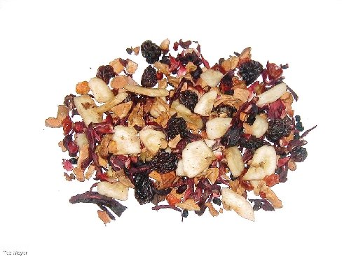 Zutaten: Apfel, Hibiskus, Hagebutte, Holunderbeeren, Weinbeeren (Weinbeeren, pflanzliches Öl), Bananenchips (Bananenbruch, Kokosöl, Zuckerkrankheit, Honig), Ausdünstung.