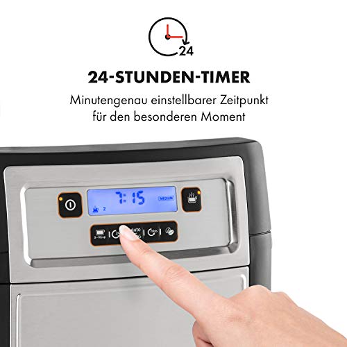 TIMER-FUNKTION: Durch den integrierten Timer kann die Klarstein Aromatica II Kaffeemaschine problemlos zum minutengenau festgelegten Zeitpunkt starten – so wird man morgens von frischem Kaffeeduft geweckt oder kehrt abends zu einer aromatischen Stärkung heim.