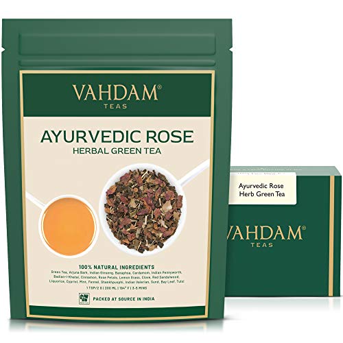 Grüner Tee mit 21 alten Heilkräutern – Dieser traditionelle ayurvedische Tee enthält 21 Kräuter wie Arjun Baumrinde, Ashwagandha, Veilchenblüte, Kardamom, Brambhi, Sternanis, Zimt, Rosenblüten, Zitronengras, Gewürznelke, rotes Sandelholz, Mulatte, Nagar Matha, Pfefferminze , Fenchel, Shankhpushpi, Sugandh Bala, Sund, Lorbeerblätter, Rama Tulsi, Krishna Tulsi und Varna Tulsi. Im Gegensatz zu Bio-Grüntee, ist dieser Loseblatt-Grüntee reich an Antioxidantien