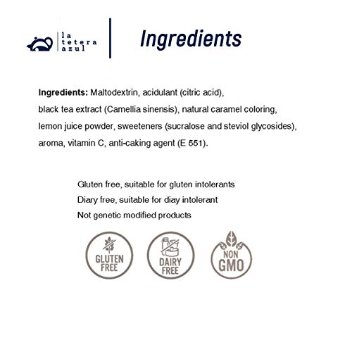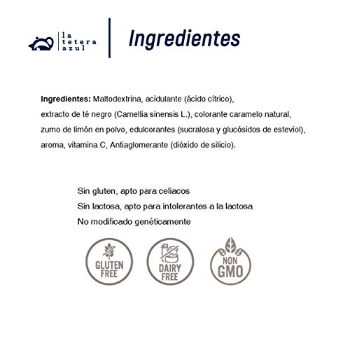 Inhaltsstoffe: Maltodextrin, Säuerungsmittel (Zitronensäure), Schwarzteeextrakt (Camelliasinensis L.), natürliche Karamellfarbe, Zitronensaftpulver, Süßstoffe (Sucralose- und Steviolglykoside), Aroma, Vitamin C, Antibackmittel (Siliziumdioxid) .
