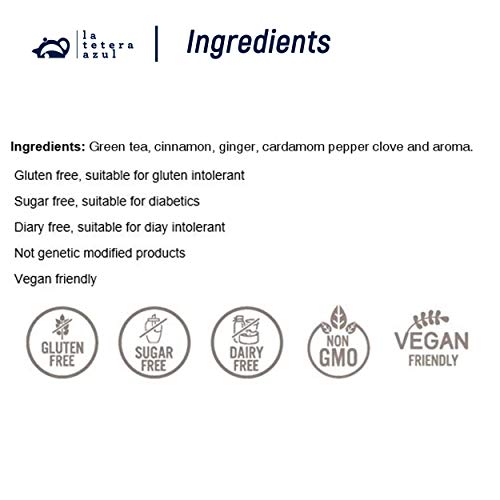 Ingwer, Kardamom, Zimt, Nelken Des Weiteren Pfeffer werden behutsam anhand grünem Tee gemischt, um eine authentische Wirkung zu erzielen Die beste Masala Chai-Infusion allesamt Indien von La Tetera Azul.