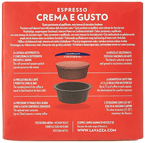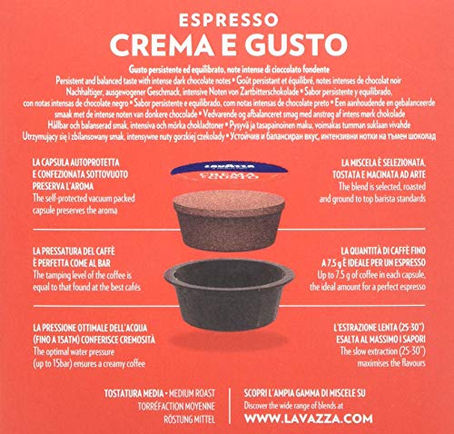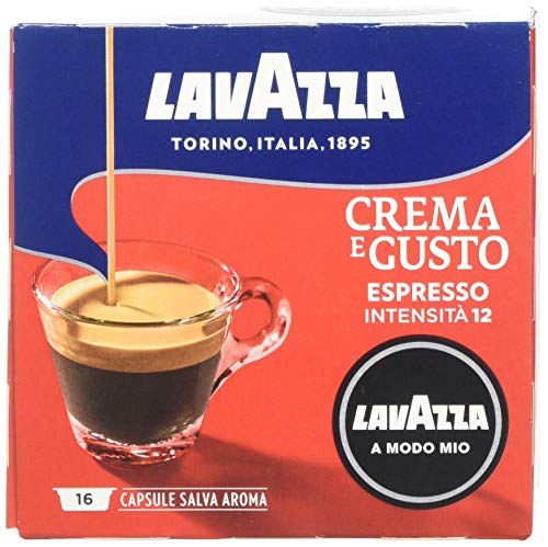 Harmonisch und cremig So prÃsentiert sich Crema e Gusto A Modo Mio. Die Arabica-Sorten sämtliche Brasilien und die Robusta-Sorten sämtliche Alte Welt und SÃdostasien vereinen sich zu einer kÃrperreichen, intensiven Kaffeemischung mit Hilfe von likÃrigen, leicht wÃrzigen Noten und einem Kakaofinale. Ein hochwertiger Klassiker, optimal fÃr die Klan und fÃr GÃste. Die Kapseln sind andererseits fÃr Lavazza A Modo Mio Kaffeemaschinen angebracht. Produzent / Hergestellt fÃr: Luigi Lavazza S.p.A., Mit Hilfe von Bologna, 32, 10152 Torino TO – Italien , Zutaten:Gemahlener RÃstkaffee , Lieferumfang:1 Packung Lavazza A Modo Mio Crema e Gusto, Kaffee, Kaffeekapseln, Gemahlener RÃstkaffee, 16 Kapseln