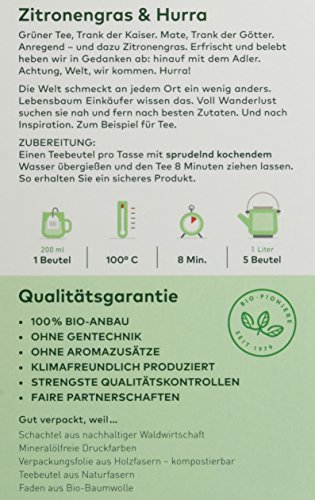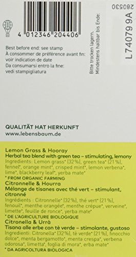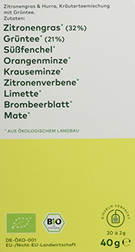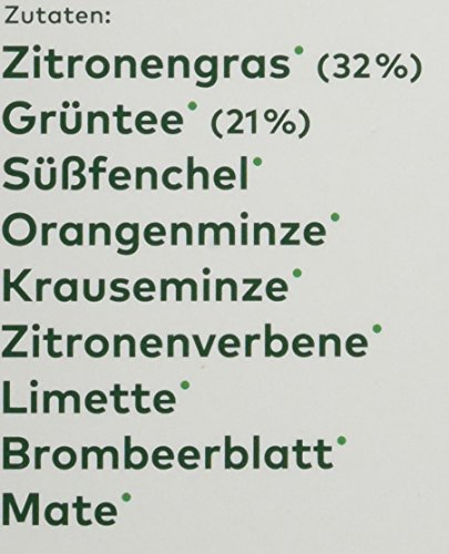 Zitronengras* (32 %), Grüntee*(21%), Süßfenchel*, Orangenminze*, Krauseminze*, Zitronenverbene*, Limette*, Brombeerblatt*, Mate*. * = Zutaten aufgebraucht ökol. Bestellung