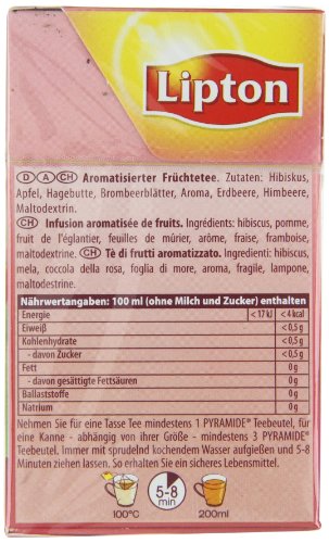 Die wohltuende Pause – der zarte Geschmack der harmonischen Mischung aus reifen Erdbeeren und Himbeeren verwöhnt Ihre Sinne und erinnert an einen lauen Sommernachmittag. Jede einzelne Lipton PYRAMIDE wartet darauf Ihren weichen, sinnlichen Geschmack in Ihre Tasse zu zaubern.