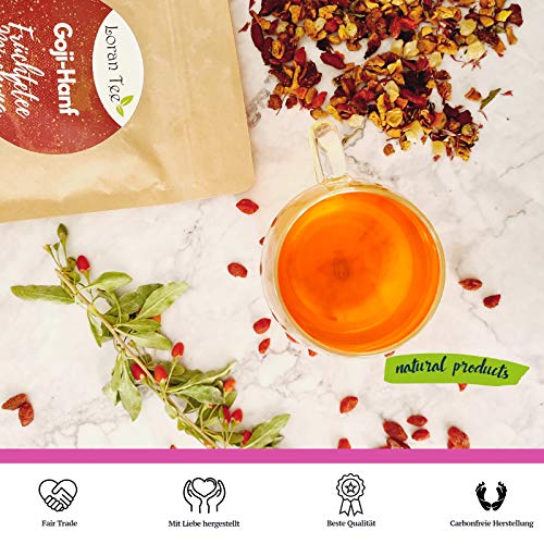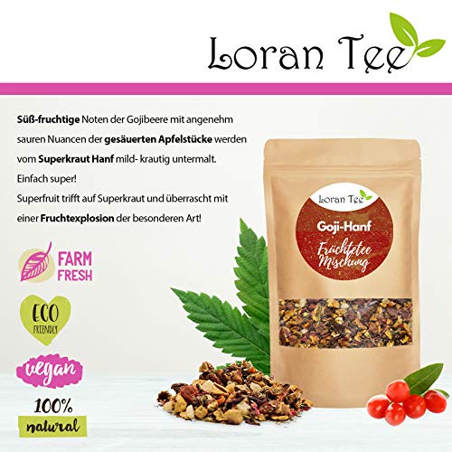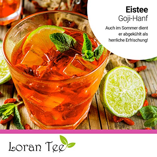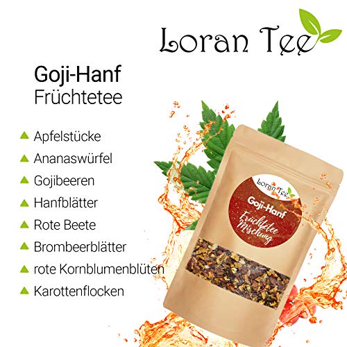 Hanftee wurde bereits vor tausenden traditionell eingesetzt und erlebt aktuell ein echtes „Comeback“. Unser Loran Goji-Hanf hat nur aufgrund ihres Geschmacks eine betörende, im Gegensatz dazu nicht berauschende Wirkung. Wir sind uns hart im Nehmen, dass unser „Superkraut“ aka Dich begeistern wird, wie fruchtig-frischer Früchteteemischung. Entdecke aka Du deinen Favoriten. Zutaten: Apfelstücke, gesäuerte Apfelstücke (Apfel, Säuerungsmittel: Citronensäure), Ananaswürfel (Ananas, Zucker), Gojibeeren (9%), Hanfblätter (5%), natürliches Aroma, Rote Beete, Brombeerblätter süß, rote Kornblumenblüten, Karottenflocken. Durchschnittliche Nährwerte pro 100 ml Energie in kJ33KJ Energie in kcal8KCAL Dick