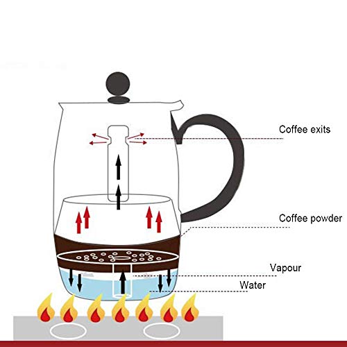 Diese Moka kann mit Gasherd, Alkohollampe, Induktionsherd, Gasherd, Elektrokeramikofen erhitzt und extrahiert werden.