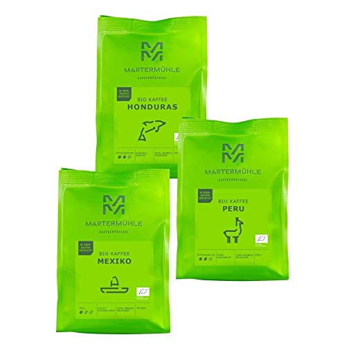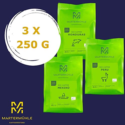 Martermühle Bio Kaffeebohnen Probierset 3x250g mild/mittelkräftig I Arabica I Ganze Bio Kaffee-Bohnen schonend geröstet…