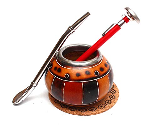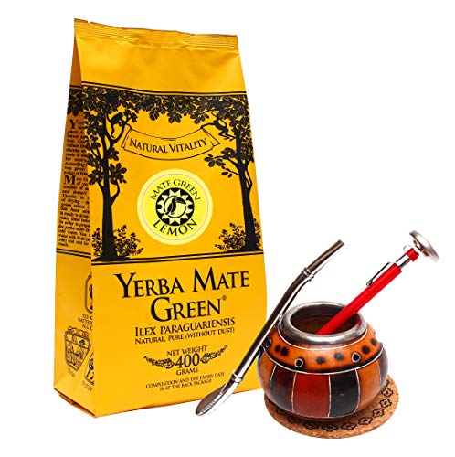 Das Set besteht jeglicher: – originalem handgemachten Mate Becher mit einer Kapazität von ca. 200ml – Yerba Mate Green 400g – einem Thermometer zur Messung der Wassertemperatur zum Aufbrühen von Yerba Mate Green benachbart der Temperatur von maximal 75-80c – stahlstrohhalm 19cm – hochwertige korkuntersetzer