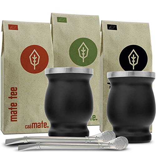 Komplett-sorglos Mate Set: 3 Bio Matesorten je 100g Mate Tee, Erva Mate & Yerba Mate (insg. 300g Mate) + 2 original Bombillas (Trinkhalm) + 2 Kalebassen doppelwand Desdign (Mate Becher) + Zubereitungsanleitung.