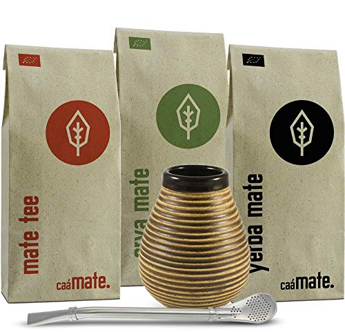 Komplett-sorglos Mate Set: 3 Bio Matesorten je 100g Mate Tee, Erva Mate & Yerba Mate (insg. 300g Mate) + 1 original Bombillas (Trinkhalm) + 1 Keramik Kalebassen (Mate Becher) + Zubereitungsanleitung.