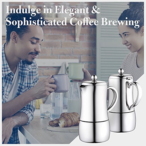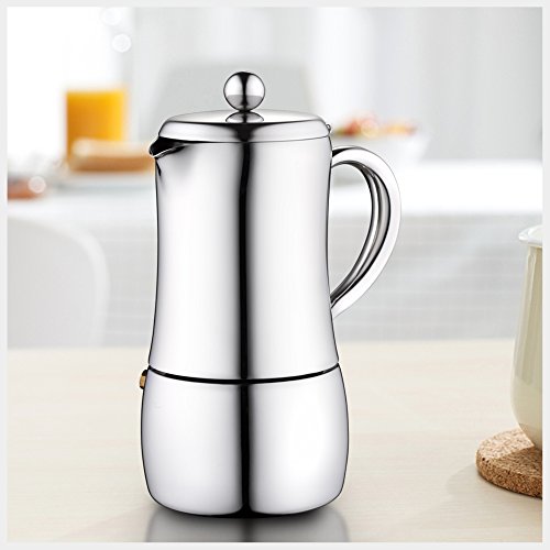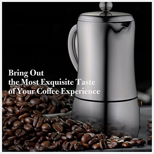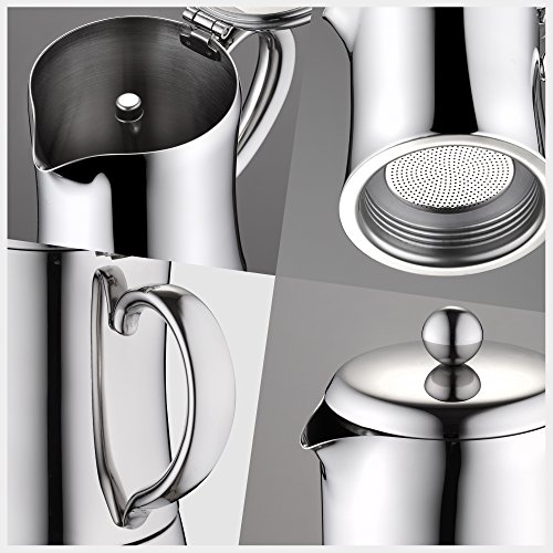 Entworfen mit schwerem Edelstahl, ist es für die Ewigkeit geschaffen. Edelstahl ist im Überfluss stärker und kann intensiver Hitze mehr vertragen als Aluminium (weshalb die meisten Mokka-Töpfe sind), was ihm eine im Überfluss längere Lebensdauer als andere Marken verleiht.