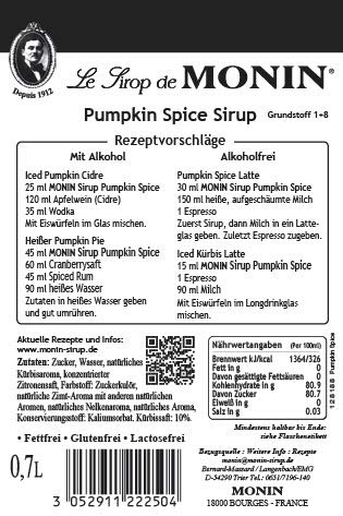 Der Kürbis erobert die Getränkewelt! Mit Gewürzen und Aromen denn Zimt, Nelken, Ingwer und Muskat ist der Monin Sirup Pumpkin Spice ideal zur Zubereitung von Milch, Kakao, Latte Macciato oder anderen herbstlichen Heißgetränken.