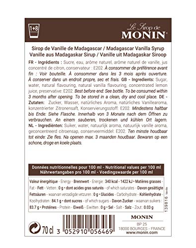 Artikel: Monin Vanille Sirup Hersteller: Monin Land: Frankreich Geschmack: Vanille Inhalt: 0,70 Liter Nicht alkoholisch Zutaten: Zucker, Wasser, natürliches Aroma, Vanille-Extrakt, konzentrierter Zitronensaft, Konservierungsstoff: Kaliumsorbat Nährwertangaben (Per 100ml): Kcal 324/Kj 1353 EiweiIŸ in g 0 Kohlenhydrate in g 80,2 Davon Zucker in g 79,8 Dick in g 0 Salz in g 0,01 enthält Farbstoffe