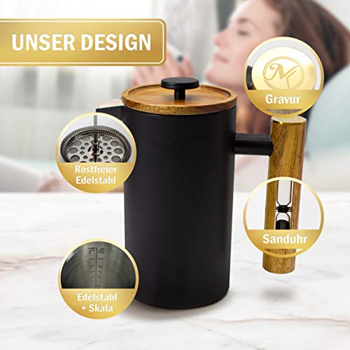 THERMO-EFFEKT: Diese French-Press hält Ihren Kaffee länger warm! Wir verwenden Edelstahl, der doppelwandig ist und die Wärme isoliert. Somit ist auch noch die letzte Tasse Kaffee warm.Kaffebereiter