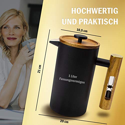 IDEALE GRÖßE: Alle nasenlang neuen Kaffee aufbrühen nervt? Kein Problem! Mit einem Fassungsvermögen von 1 Liter hat unsere Stempelkanne die optimale Größe! Einmal Kaffee zubereiten und lange genießen