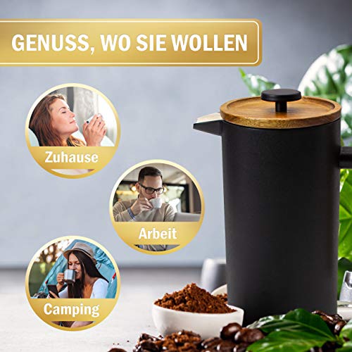 THERMO-EFFEKT: Diese French-Press hält Ihren Kaffee länger warm! Wir verwenden Edelstahl, der doppelwandig ist und die Wärme desolat. Somit ist aka noch die letzte Tasse Kaffee warm.Kaffebereiter