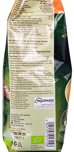 Verarbeitung: Köstlicher Lust ohne Koffein: Der Lupinenkaffee von Naturata sorgt für wahre Genussmomente. Die harmonische Diverses allesamt Lupinen, Roggen und Zichorien entfaltet ihr kräftiges, vollmundiges Aroma samt feiner Crema beim Übergießen mit heißem Wasser. Da Lupinenkaffee koffeinfrei ist, kann er zu leer Tageszeit bedenkenlos konsumiert werden. Die Lupine ist übrigens eine geschätzte Nutzpflanze in der biologischen Bestellung, da sie dem Boden Nährstoffe zuführt. Zertifizierung/enEU Bio-Amtszeichen