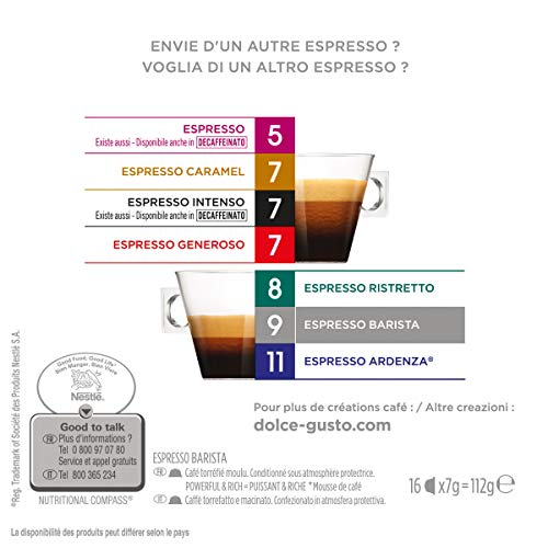 Der NESCAFÉ Dolce Gusto Espresso Barista ist einer unserer Stärksten unter den starken Kaffee-Kompositionen. Mit abundant Crema, samtigem Aroma und intensiver Adresse verbreitet der Barista ein außergewöhnliches, italienisches Kaffeegefühl. Seinen ausgewogenen, kräftigen Geschmack verdankt er der harmonischen Verbindung von zaghaft ausgewählten Robusta und Arabica Bohnen. Genießen Sie diese intensive Komposition zum Ausklang einer feinen Mahlzeit oder bei einer kleinen Arbeitspause als genussvollen Kick zwischendurch. Mit seinem außergewöhnlichen, köstlichen Aroma weckt der Espresso Barista Ihre Sinne und sorgt für ein unvergessliches Geschmackserlebnis. Die NESCAFÉ Dolce Gusto Kapsel enthält feinen, gemahlenen Robusta- und Arabica-Röstkaffee, der nach allen Regeln der Kunst veredelt wurde. Das wunderbare Aroma ist in den luftdichten Kapseln ohne Lücke eingeschlossen und wird erst bei der Zubereitung freigegeben. Der Espresso Barista garantiert Tasse für Tasse für anregenden Kaffeegenuss. Nährwerte 100 g Pro 1 Tasse (35 ml) RM* Espresso Barista Brennwert kJ kcal 1094 267 8 2