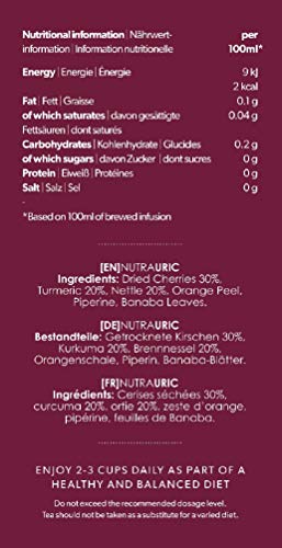 GROßARTIG SCHMECKENDE EINZIGARTIGE KRÄUTERMISCHUNG – Getrocknete Kirschen 30 %, Kurkuma 20 %, Brennnessel 20 %, Orangenschale, Piperin, Banaba-Blätter.