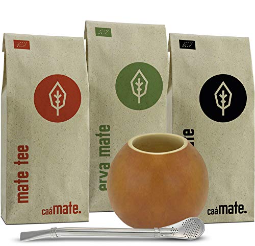 INHALT: 3 Bio Matesorten je 100g Mate Tee, Erva Mate & Yerba Mate, 1 Edelstahl Bombilla – rostfrei, spülmaschinenfest und kein Verstopfen auf Basis von das feine Trinksieb, 1 Kalebasse (Mate Becher die Gesamtheit Kürbis) – Handgeschliffen 150-200ml