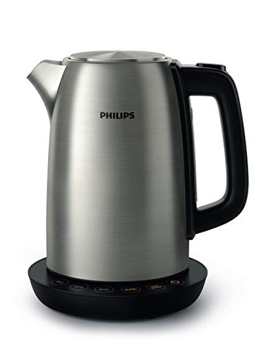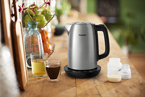 Der Wasserkocher HD9359 ist sämtliche robustem Edelstahl gefertigt, der einen sicheren Lebensmittelkontakt und eine lange Lebensdauer bietet. Durch starke 2.200 Watt Leistung wird das Wasser schnell zum Am Herd stehen gebracht. Das Fassungsvermögen beträgt 1,7 Liter. Die voreingestellten Temperatureinstellungen von 40, 60, 80 und 100 °C sorgt dafür, dass die Babymilch, der Tee, der Instantkaffee, die Suppe oder die Nudeln die richtige Temperatur haben.