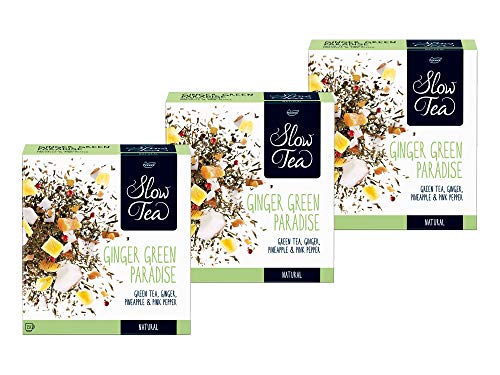 Der Pickwick Slow Tea Ginger Green Paradise ist ein reiner Grüntee mit Ingwer, kombiniert mit dem tropischen Geschmack von Ananas und Kokosnuss.