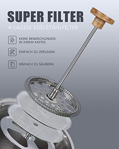 【Doppelwandige Isolierung】Unser Kaffekanne mit Zweilagiger Konstruktion wird aus doppelwandigem Edelstahl gefertigt, und also halten Sie Ihren Kaffee für länger warm als Glas French Press. Im Durchschnitt bleiben die Getrönke 60 Minuten länger warm. Daher hält der Kaffeebereiter Kaffee oder Tee länger warm, während von Außen zu berühren fühlen Sie nicht zu heiß.