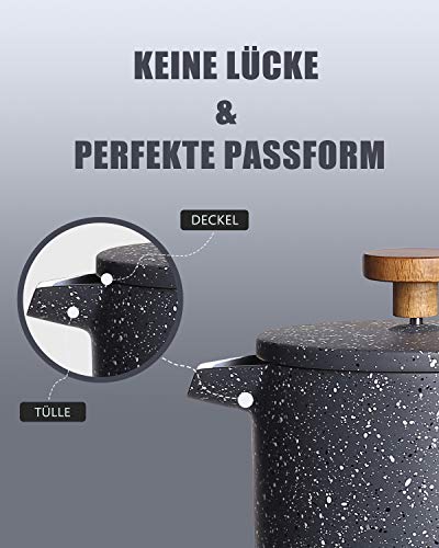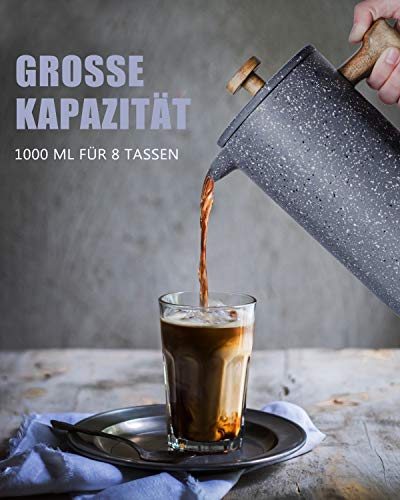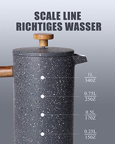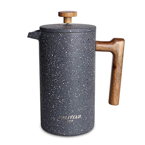 Poliviar French Press 1 Liter/8 Tassen, Kaffeebereiterï¼Doppelwandige isolierte Kaffeekanne, Teebereiter, Handfilter Kaffee Presse mit Plunger & Griff aus Massivholz (Stein) JX2019-FPG10-DE