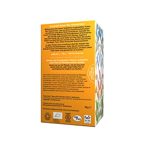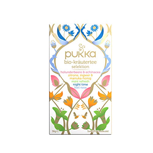 Bio-Tee Selektion mit fünf verschiedenen Tees, zum Durchprobieren und Lieblingstee-Finden: Holunderbeere & Echinacea und Zitrone, Ingwer & Manuka-Honig sowie Night Time, Drei Minze und Detox. Alle Zutaten sind biologisch und werden fair und nachhaltig gewirtschaftet. Durch die Fair for Life- und FairWild-Zertifizierung hilft Pukka seinen Anbaupartnern und hilft, Umwelt & Wildpflanzen zu schützen.Jede Pukka Teemischung (in England von unseren Kräuterexperten Sebastian Pole entwickelt) verwendet die unglaubliche Kraft bester Bio-Kräuter und -Pflanzen. Und dahinter steht unsere Pukka Philosophie – „wahrhaft“ und „authentisch“ zu sein. Sie inspiriert unser ganzes Walten: unsere gentechnikfreien Produkte, unseren Einsatz für Umwelt- und Sozialprojekte sowie das Engagement, unseren Lieferanten faire Preise zu zahlen und sie in ihrer nachhaltigen Landwirtschfat zu verankern.Die volle Kraft der Kräuter für dein Wohlbefinden – das steckt in den biologischen Pukka Tees, die Pukka aufmerksam nach altem ayurvedischen Wissen zusammengestellt hat. Ayurveda ist eine traditionelle, holistische indische Philosophie, die dem Menschen zeigt, wie er ein gesundes und erfüllteres Leben verbringen kann, indem er Geist, Körper und Seele in Balance bringt.Zur Unterstützung der inneren Balance können auch Yoga-Übungen, Meditation und Atemübungen beitragen. „1% for the Planet“Seit 2015 ist Pukka als CO2-neutrales Unternehmen zertifiziert und spendet als überzeugtes Mitglied der Initiative „1% for the Planet“ 1% des Verkaufserlöses für Umwelt- und Sozialprojekte. Der CO2-Ausstoß durch Gas, Kühlsysteme, Elektrizität, Wasser, Gefälle, Gütertransport und Papier wurde überprüft und abgestimmt. Darüber hinaus reduziert das Unternehmen seinen Energieverbrauch durch eine energieeffiziente IT-Ausstattung sowie die Bike-to-work-Philosophie.FairWild bei Pukka Seit 2012 unterstützt das Unternehmen Pukka Herbs aktiv die Weiterentwicklung dieses 2008 etablierten Umweltschutz-Standards. Er gibt Richtlinien für die nachhaltige Nutzung und den Handel natürlicher Zutaten für Nahrung, Kosmetika und Pharmakon aus Wildsammlung vor. Die Einhaltung des Standards gewährleistet, dass Wildpflanzen und natürliche Zutaten naturnah bewirtschaftet und geerntet werden, und dass diejenigen, die in die Konglomerat und den Handel eingebunden sind, einen fairen Lohn für ihr Wissen und ihren Einsatz bekommen. Der Standard wurde nach umfangreicher Beratung mit Pflanzenexperten und Vertretern internationaler Unternehmen entwickelt, die pflanzliche Produkte umwandeln und mit ihnen Walten. (fairwild.org/news-german/)