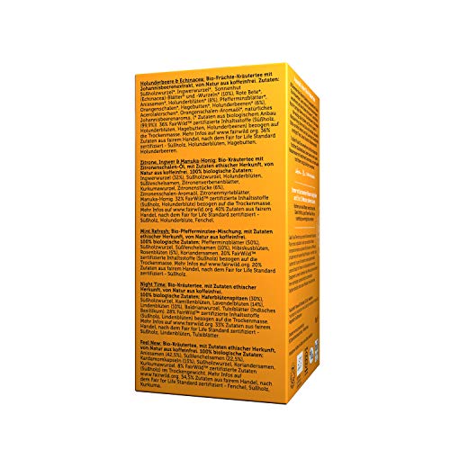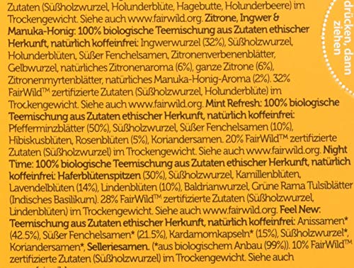 Zutaten: #Zutaten Bio-Kräutertee Selektion – Holunderbeere & Echinacea: Süßholzwurzel¹, Ingwerwurzel¹, Sonnenhut (Echinacea)-Blätter¹ und -Wurzeln¹ (10%), Rote Bete¹, Anissamen¹, Hagebutten¹, Holunderblüten¹ (8%), Pfefferminzblätter¹, Orangenschalen¹, Holunderbeeren¹ (6%), Hibiskusblüten¹, Orangenschalenölaroma¹, natürliches Johannisbeerenaroma. (¹ Zutaten aus biologischem Landbau (99,9%)) 36% FairWild™ zertifizierte Inhaltsstoffe (Süßholz, Holunderblüten, Hagebutten, Holunderbeeren, Hibiskus) bezogen auf die Trockenmasse. 38% Zutaten aus fairem Handel, nach dem Fair for Life Standard zertifiziert – Süßholz, Holunderblüten, Hagebutten, Holunderbeeren. #Zutaten Bio-Kräutertee Selektion – Feel New: 100 % biologische Anissamen (32,5%), Süßfenchelsamen (32,5%), Kardamomkapseln (15%), Süßholzwurzel, Koriandersamen, Kurkumawurzel. 8% FairWild™ zertifizierte Zutaten (Süßholz) im Trockengewicht. 44,5% Zutaten aus fairem Handel, nach dem Fair for Life Standard zertifiziert – Fenchel, Süßholz, Kurkuma. #Zutaten Bio-Kräutertee Selektion – Zitrone, Ingwer & Manuka-Honig: 100 % biologische Ingwerwurzel (32%), Süßholzwurzel, Holunderblüten, Süßfenchelsamen, Zitronenverbenenblätter, Kurkumawurzel, Zitronenstücke (6%), Zitronenschalenölaroma (6%), Zitronenmyrteblätter, natürliches Manuka-Honig-Aroma. 32% FairWild™ zertifizierte Inhaltsstoffe (Süßholz, Holunderblüte) bezogen auf die Trockenmasse. 40% Zutaten aus fairem Handel, nach dem Fair for Life Standard zertifiziert – Süßholz, Holunderblüte, Fenchel. #Zutaten Bio-Kräutertee Selektion – Night Time: 100% biologische Haferblütenspitzen (30%), Süßholzwurzel, Kamillenblüten, Lavendelblüten (14%), Lindenblüten (10%), Baldrianwurzel, Tulsiblätter (Indisches Basililkum). 28% FairWild™ zertifizierte Inhaltsstoffe (Süßholz, Lindenblüten) bezogen auf die Trockenmasse. 33% Zutaten aus fairem Handel, nach dem Fair for Life Standard zertifiziert – Süßholz, Lindenblüten, Tulsiblätter. #Zutaten Bio-Kräutertee Selektion – Mint Refresh: 100 % biologische Pfefferminzblätter (50%), Süßholzwurzel, Süßfenchelsamen (10%), Hibiskusblüten, Rosenblüten (5%), Koriandersamen. 20% FairWild™ zertifizierte Inhaltsstoffe (Süßholz) bezogen auf die Trockenmasse. 20% Zutaten aus fairem Handel, nach dem Fair for Life Standard zertifiziert – Süßholz.