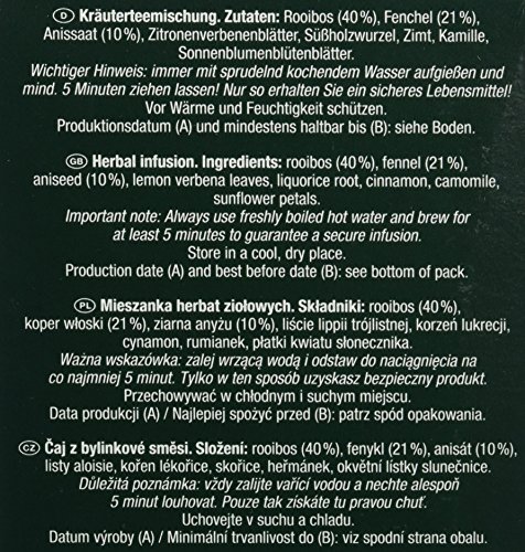 Rooibos(40%); Fenchel(21%); Fenchel; Anis Samen(10%); Anis Samen; Zitronenverbenenblätter; Süßholzwurzel; Zimt; Kamille; Sonnenblumenblütenblätter