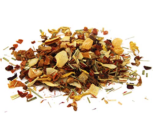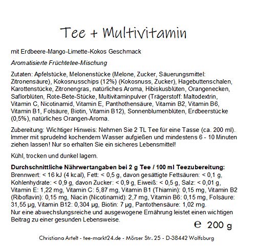Zutaten: Apfelstücke, Melonenstücke (Melone, Zucker, Säuerungsmittel: (Zitronensäure), Kokosnusschips (12%) (Kokosnuss, Zucker), Hagebuttenschalen, Karottenstücke, Zitronengras, natürliches Aroma, Hibiskusblüten, Orangenecken, Saflorblüten, Rote-Bete-Stücke, Multivitaminpulver (Trägerstoff: Maltodextrin, Vitamin C, Nicotinamid, Vitamin E, Panthothensäure, Vitamin B2, Vitamin B6, Vitamin B1, Folsäure, Biotin, Vitamin B12), Sonnenblumenblüten, Erdbeerstücke (0,5%), natürliches Orangen-Aroma.