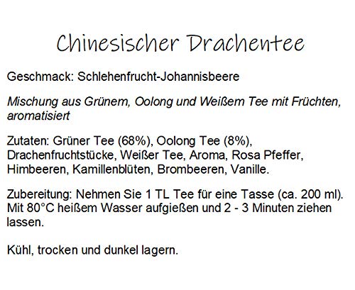 Zutaten: Grüner Tee (68%), Oolong Tee (8%), Drachenfruchtstücke, Weißer Tee, Aroma, Rosa Pfeffer, Himbeeren, Kamillenblüten, Brombeeren, Vanille.