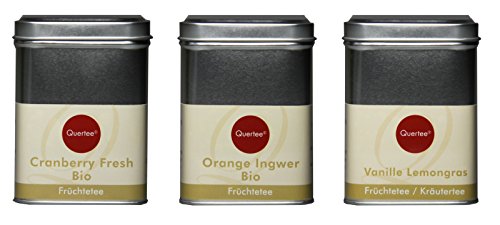 Quertee – Teegeschenk – 3 verschiedene Tee in der Teedose. Bio – Früchtetee – „Cranberry fresh“ – 120 g Früchtetee, aromatisiert Geschmack: Fruchtige Cranberry Zutaten: Apfelstücke*, Lemongras*, Cranberries* (6%) (Cranberries, Apfelsaftkonzentrat, Sonnenblumenöl), Zitronenschalen*, Kokosnusschips*, rosa Pfefferkörner*, natürliche Aromen. Zubereitung: Betrag: 2 TL Wassertemperatur: 100°C Zeit zum Ziehen 6 – 10 Minuten Bio – Früchtetee – „Orange Ingwer“ – 100 g Früchtetee, aromatisiert Geschmack: Orange mit feinem Ingwer Zutaten: Apfelstücke*, Hibiskusblüten*, Hagebuttenschalen*, Orangenschalen*, Ingwerstücke* (7%), Lemongras*, Hawaiananas* (Hawaiananas, Reismehl), natürliches Orangenaroma, Ringelblumenblüten*. Zubereitung: Betrag: 2 TL Wassertemperatur: 100°C Zeit zum Ziehen 6 – 10 Minuten Früchtetee – „Vanille – Lemongras“ – 120 g Früchte-/ Kräuterteemischung, aromatisiert Geschmack: Vanille-Zitrus Zutaten: Apfelstücke, Orangenecken, Grüner Rotbuschtee, Lemongras (11%), Verbenenblätter, Aromen, Vanillestücke (1%). Zubereitung: Betrag: 2 TL Wassertemperatur: 100°C Zeit zum Ziehen 6 – 10 Minuten * = Ganz kontrolliert biologischem Bestellung Unsere Kontrollstelle: DE-ÖKO-007