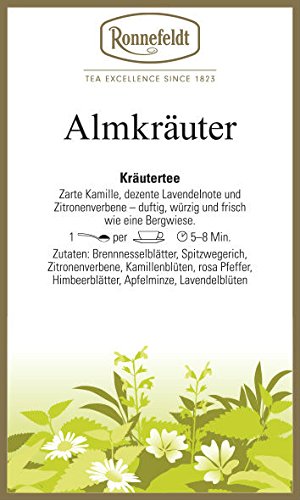 Almkräuter KRÄUTERTEE Zarte Kamille, dezente Lavendelnote ebenso Zitronenverbene – duftig, herzhaft ebenso alternativ denn eine Bergweide. Bestandteile: Brennnesselblätter, Spitzwegerich, Zitronenverbene, Kamillenblüten, rosa Pfeffer, Himbeerblätter, Apfelminze, Lavendelblüten