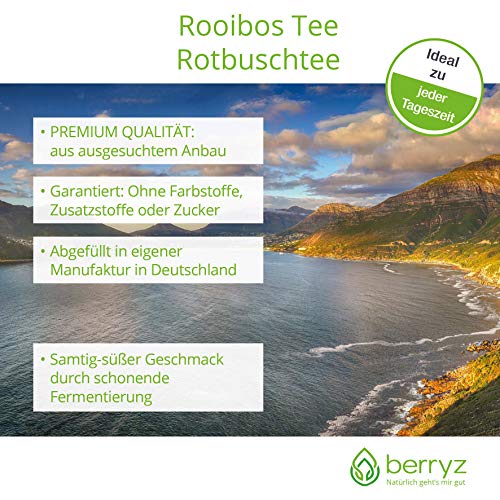 Rooibos / Rotbusch Tee ist das Nationalgetränk Südafrikas. Durch schonende Fermentierung entsteht der besondere, samtig-süße Geschmack und die ergötzlich rötliche Färbung.