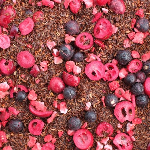 Fruchtiger Cranberry-Geschmack. Rooibos, Cranberries, schwarze Johannisbeeren, Ausdünstung u. a. Erdbeerstücke.