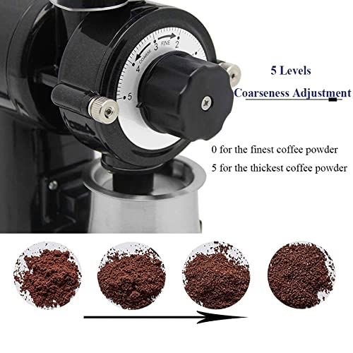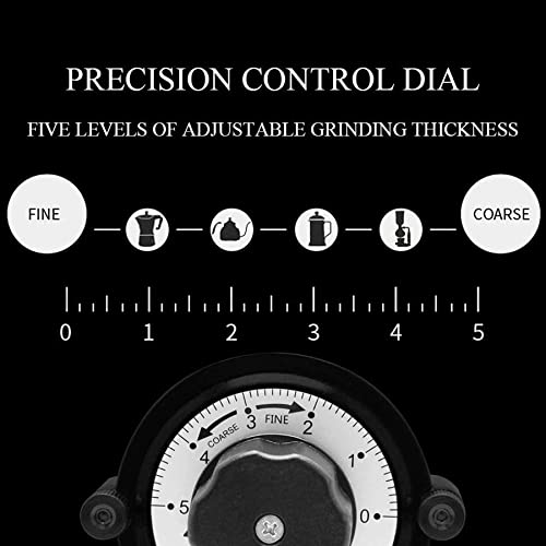 ★ 5-Spezifizieren-Grobheitseinstellung: Der Präzisionsregler stellt die Dicke des Kaffeepulvers dar, 0 für das feinste Kaffeepulver, 5 für das dickste Kaffeepulver. Es gibt auch Mikroanpassungen zwischen 5 Einstellungen. Es ist sehr praktisch, die Dicke durch leichtes Drehen des Knopfes angebracht dem tatsächlichen Bedarf einzustellen.