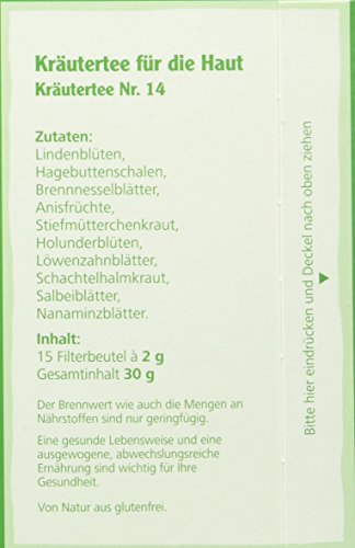 Zutaten:Lindenblüten, Hagebuttenschalen, Brennnesselblätter, Anisfrüchte, Stiefmütterchenkraut, Holunderblüten, Löwenzahnblätter, Schachtelhalmkraut, Salbeiblätter, Nanaminzblätter.