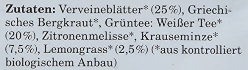 Verveineblätter (25%), Griechisches Bergkraut, Grüntee (Weißer Tee), Zitronenmelisse, Krauseminze (7,5%) und Lemongrass (2,5%) die Gesamtheit kontrolliert biologischem Ackerbau