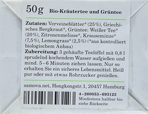 Zutaten: Verveineblätter (25%), Griechisches Bergkraut, Grüntee (Weißer Tee), Zitronenmelisse, Krauseminze (7,5%) und Lemongrass (2,5%) die Gesamtheit kontrolliert biologischem Ackerbau – Abstammung: Verveine-Blätter die Gesamtheit Marokko, Bergkräuter die Gesamtheit Griechenland, Grüner Tee die Gesamtheit China
