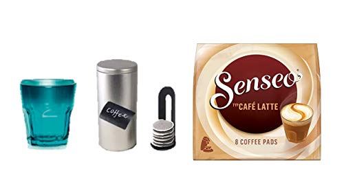 Senseo Kaffeepads Café Latte mit Becher von James Premium® T + Kaffeepaddose/Vorratsdose, inkl. 1. Etikett