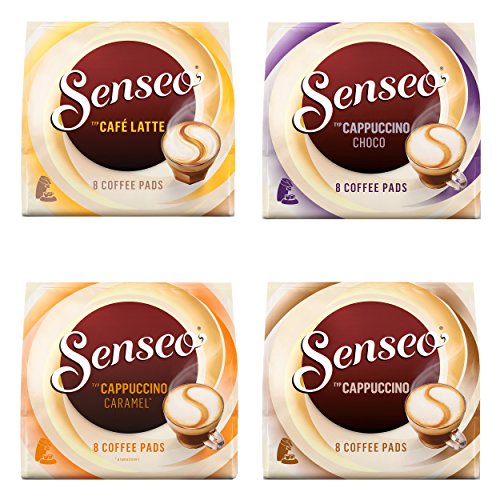 Lieferumfang:1 x 1 Packung Senseo Kaffeepads Cappuccino Choco, Kaffee mit Schokoladengeschmack, neue Rezeptur, 8 Pads1 x 1 Senseo Kaffeepads Cappuccino,Milchschaumklassiker, Kaffee, neue Rezeptur, 8 Pads1 x 1 Packung Senseo Kaffeepads Cappuccino Caramel / Karamell, Kaffee mit Karamellgeschmack, neue Rezeptur mit 8 Pads fÃr 8 Portionen Nettogewicht: 92g / Packung, 11.5g / Pad 1 x 1 Packung Senseo Cafà Latte, neue Rezeptur mit 8 Pads fÃr 8 Portionen Nettogewicht: 92g / Packung, 11,5g / Pad , Senseo Kaffeepads Cappuccino Choco, Kaffee mit Schokoladengeschmack, neue Rezeptur, 8 Pads:Aromatischer Kaffee mit Cappuccino-typischem Milchschaum und leckerem Geschmack nach Schokolade – das ist der neue Cappuccino Choco von Senseo. Das neue 2in1 Kombipad enthÃlt feinsten RÃstkaffee und eine Milchschaum-Schockoladen-Komposition. So kÃnnen Sie sich kontinuierlich bequem auf Knopfdruck Ihren Kaffee anders zubereiten. Bitte anerkennen Sie: Zur Zubereitung von Senseo Cappuccino Choco benÃtigen Sie den Senseo 2-fach-Padhalter. Cremiger Geschmack. Produzent / Hergestellt fÃr: JACOBS Douwe Egberts BV, Oosterdoksstraat 80, 1011 DK Amsterdam – NiederlandeSenseo Kaffeepads Cappuccino, Milchschaumklassiker, Kaffee, neue Rezeptur, 8 Pads:FÃr jede Auszeit der passende Begleiter! GenieÃen Sie mit Senseo Gefährte Cappuccino den Klassiker am Boden den Milchschaumkaffees vulgo zu Hause. Was auch immer was Sie dafÃr brauchen ist Ihre Senseo Kaffeepadmaschine und das patentierte 2in1 Kombipad, das eine diverse sämtliche feinstem RÃstkaffee und einer cremigen Milchschaumkomposition enthÃlt. Darum ist fÃr eine bequeme Zubereitung auf Knopfdruck gesorgt. Senseo Gefährte Cappuccino – fÃr die besonderen Genussmomente im Leben. Bitte anerkennen Sie: Zur Zubereitung von Senseo Cappuccino benÃtigen Sie den Senseo 2-fach-Padhalter. Neue Rezeptur. Produzent / Hergestellt fÃr: JACOBS Douwe Egberts BV, Oosterdoksstraat 80