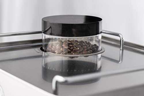 Eingebautes Scheibenmahlwerk via 25 Mahlgradeinstellungen, Mahlen der eingestellten Portion (1 oder 2 Tassen) auf Knopfdruck direkt in den Siebträger, Bohnenbehälter via 300 g Fassungsvermögen
